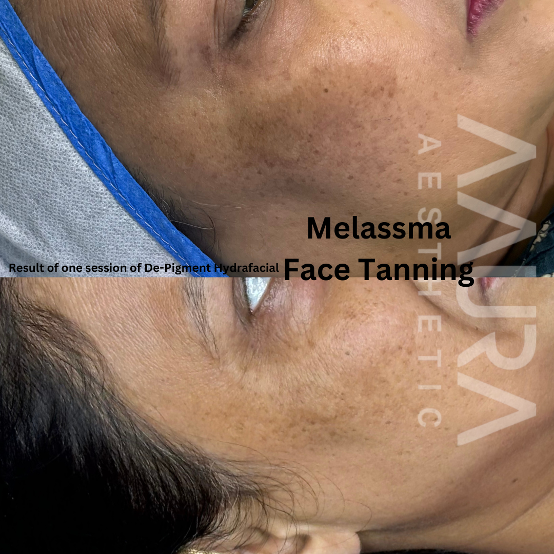 The De-Pigment Hydra Facial Treatment is a next level to basic hydrafacial which is specifically designed to address pigmentation concerns while rejuvenating and hydrating the skin. Combining the powerful cleansing and hydration properties of a Hydra Facial with targeted De-pigmentation serum, this treatment focuses on reducing dark spots, evening out skin tone, and enhancing the overall texture and radiance of the skin. This treatment is particularly effective for individuals struggling with issues like melasma, hyperpigmentation, post-inflammatory marks, and dull skin. We at AAURA Aesthetic starts the process with in depth consultation with the patient where we take history and time duration of the pigmentation occurrence to understand the actual cause.